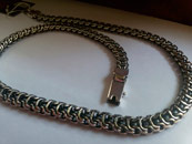 Повновісний ланцюжок.Дуже популярне серед чоловіків «плетіння Рамзес», також на просторах інтернету дане плетіння можна побачити під назвою «Подвійний зворотний Бісмарк». Особливо чоловічу увагу привертають товсті срібні ланцюжки з «Подвійного зворотного бісмарка» з розмірами близькими до розмірів на фото. І тим не менше, якщо такий ланцюжок особисто для Вас виглядає на шиї дуже громіздким або навпаки замалим, то Ви без особливих зусиль можете відкоригувати практично будь-який її параметр під свій смак, в тому числі є можливість вибрати як з чорнінням, так і без чорніння або ж з родіюванням.